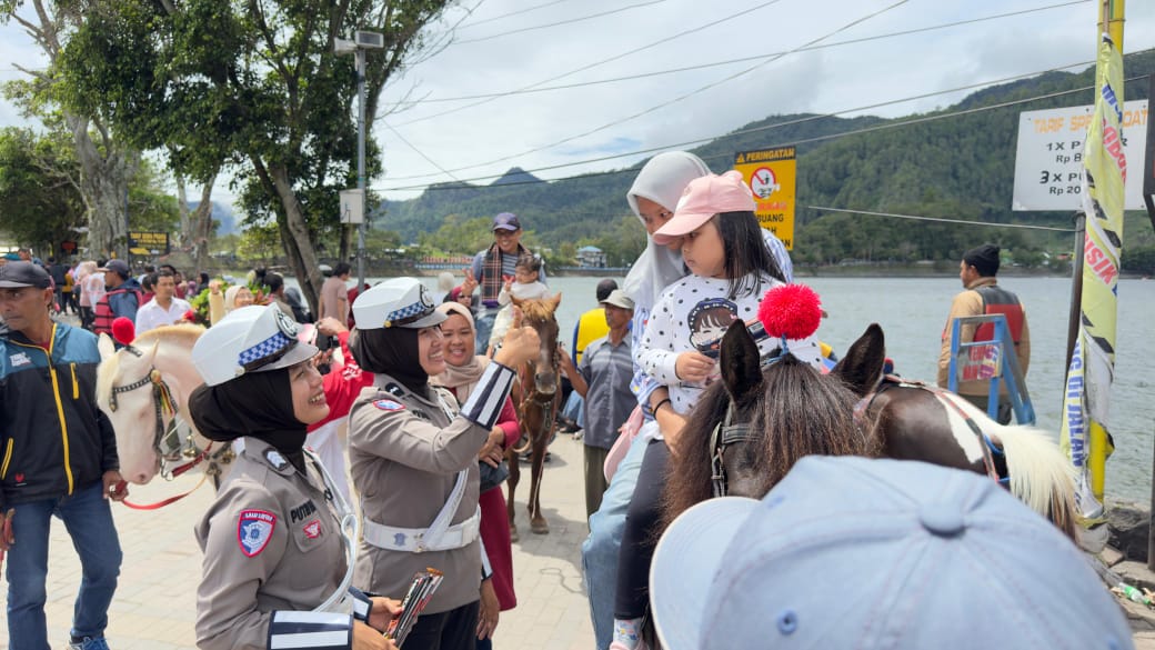 Dalam kegiatan ini, petugas memberikan himbauan Kamtibmas kepada pengunjung sekaligus membagikan coklat kepada anak-anak, menciptakan suasana yang akrab dan menyenangkan di kawasan wisata.